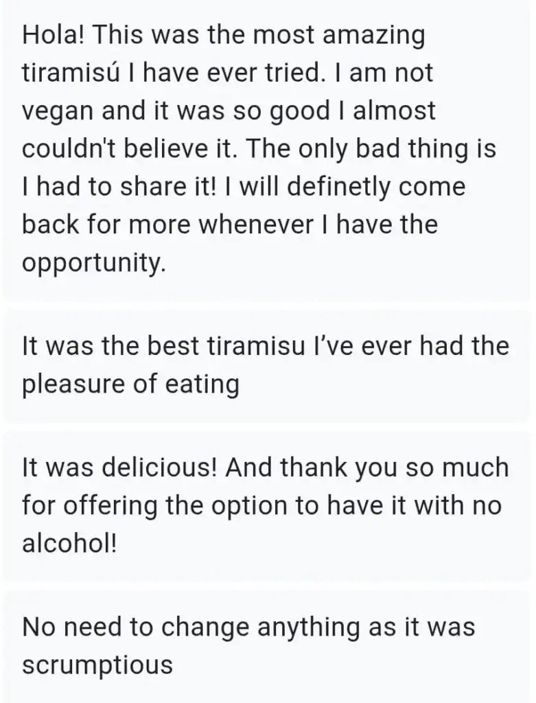 To be completely transparent, not all the reviews were perfect, we had two with some notes: “Tasted very nice but more of a trifle texture as the sponge to filling ratio was off, and it was quite sweet. Coffee flavour needs to be increased and less sponge.”